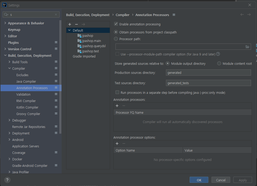 3. Settings > Annotation Processors에서 Gradle Imported에 있는 것을 모두 Default로 이동 + Enabled annotation processing check